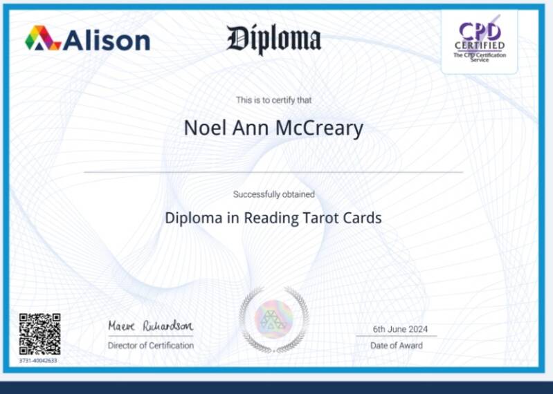 Directly above this text is my actual DIPLOMA in tarot. That backs my understanding. Again we DO NOT endorse divination, but I do have an actual formal education in tarot reading.